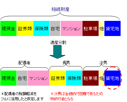 ●物納の具体的スケジュールについてはこちらをご参照ください また、不動産の物納を検討しており、相続財産に複数の不動産がある場合、その中で相続人にとって必要性の低い不動産を物納申請することがポイントとなります。また、相続税評価額が推定時価を上回っている土地や一般的な市場では流通しづらい土地も物納申請に適しているといえます。 ●物納申請財産を選択するポイントについてはこちらをご参照ください 2.物納を上手に活用するための遺産分割 相続財産に多くの現預金が含まれている場合は、金銭で相続税を納付しなければなりません。ただし、金銭納付が困難であるか否か、すなわち物納制度を活用できるかどうかは各相続人ごとに判定することになります。したがって遺産分割の方法によっては、下記の例のように現預金を残し、必要性の低い不動産を物納申請することが可能になる場合があります。 ●遺産分割による物納制度活用の例 |